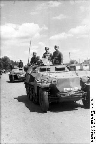 An der Sowjetfront: Deutsche Sturmgeschütze und Panzerspähwagen fahren in den Hauptstrassen umher, um etwa aufflackernden Widerstand niederzukämpfen. PK-Aufnahme: Kriegsberichter: Mittelstaedt 10133-41 "Fr." "Fr.OKW" Okt.41 Archive title: Charkow.- Sturmgeschütz III und leichter Schützenpanzer (Sd.Kfz. 250) in Straße